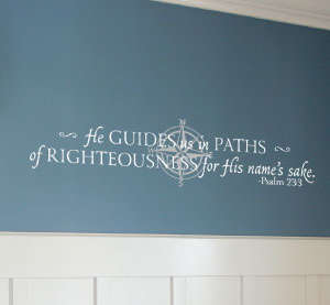 Decorating wall spaces with scripture is a tradition that has been handed down over the years from generation to generation. WiseDecor continues with this practice, but adds a decorative twist to it- with great results! “He guides me in paths of righteousness for His name’s sake.-Psalm 23:3” wall words are an example of what we have in store. They are perfect for this bedroom! They pop out against the blue underlying wall, above the bed. Waking up to this amazing promise is a great way to start your day, every day! The theme in this bedroom is sea based. The blue wall reflective of the sky and the sea is a great background for the wall letters. The lettering style is a mixture of bold and festive which creates a reassuring mood of God’s ability to keep His word concerning us! They also tie in with the duvet, and the sleeping bag. While the framed photo captures the owners love for all things sailing, our wall quotes, navigation compass and lettering art show their appreciation of God’s guidance as they sail out! The lettering is easy to apply. It is pre-spaced and takes out the guesswork and hassle of doing this on your own. When placing your order use our previewer to make sure that you have chosen the right style, size and color for your wall space. Get in touch for stylish wall decals! |