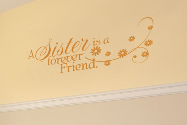 ‘A sister is a forever friend’ wall words are a wonderful way to help your little girls appreciate each other. These wall quotes were applied on the wall above the bed in a room shared by two sisters. The swirls and lettering art made them even more lovely to look at. They created a joyous mood. They tie in well with the rest of the decor in the room. The girls will love sharing this room: the wall letters will help form a bond that will get stronger with time.
