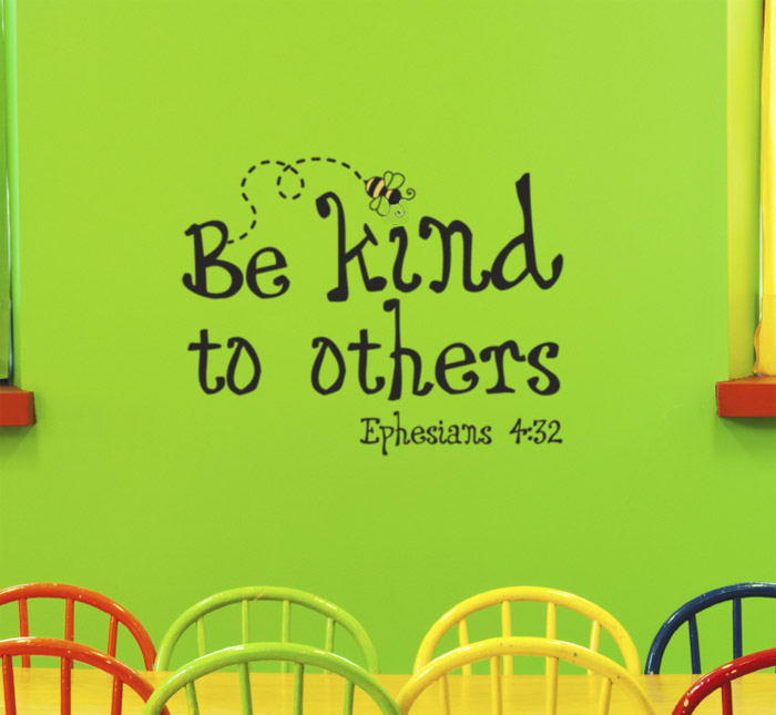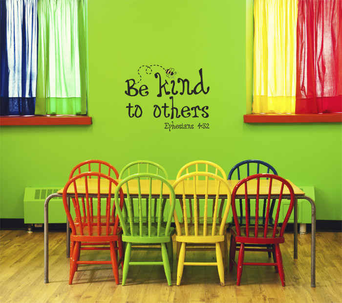 ‘Be kind to others-Ephesians 4:32’ wall decals are suitable for every room. The black wall lettering and bright yellow letter art are lovely to look at. They do brighten this room and tie in well with the multi-colored chairs, wooden floor and the lime green walls. Kids will not only enjoy growing up in this room but they will learn how to treat everyone around them. What a treasure!