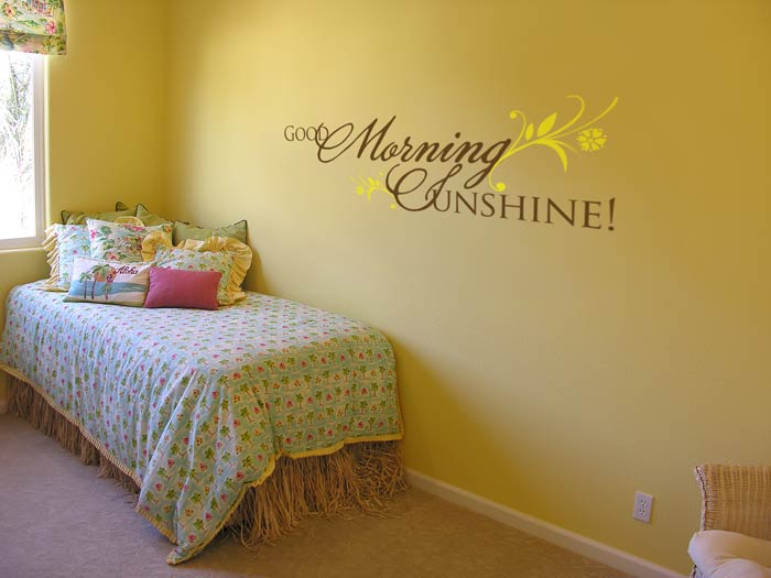 At DecorativeLettering we have wall words that are suitable for your little girl’s room. ‘Good Morning Sunshine!’ wall decals are a lovely way to greet your daughter every day. These two colored wall letters look wonderful on this pale yellow underlying wall! They were applied on the wall that is next to the bed. The bright colored wall lettering art gives this room a stylish look. Your little girl will grow knowing that you cherish her. How precious!