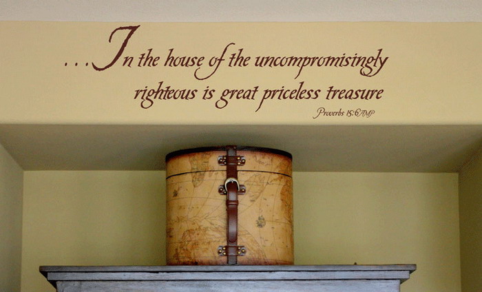 ‘In the house of the uncompromisingly righteous is a great priceless treasure. Proverbs 15:6 ‘ wall words sum up a believers life after salvation. These wall quotes are available as wall decor for all your rooms. Apply them onto the wall above the fireplace, or in the kitchen above the back splash. They will also look great in the bedrooms above the bed and in the entryway. Any free wall space will look amazing with these wall letters.