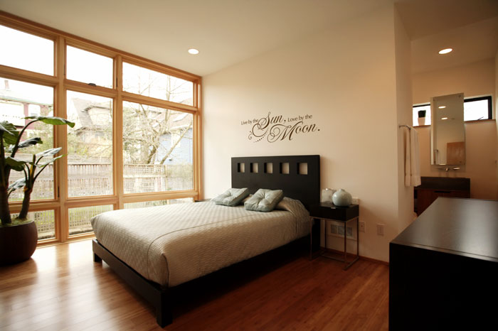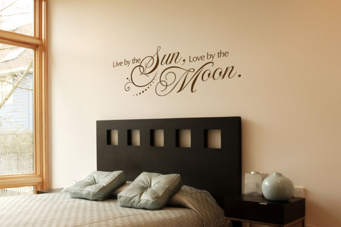 ‘Live by the Sun, Love by the Moon’ wall words are suitable for all rooms. In this particular photo, they look great in the bedroom. Wall to wall windows, green potted plants, brown wooden floor and dark furniture make this room comfortable! Waking up and going to bed in this room is an absolute delight! The wall quotes are the icing on the cake and they tie in well with everything!