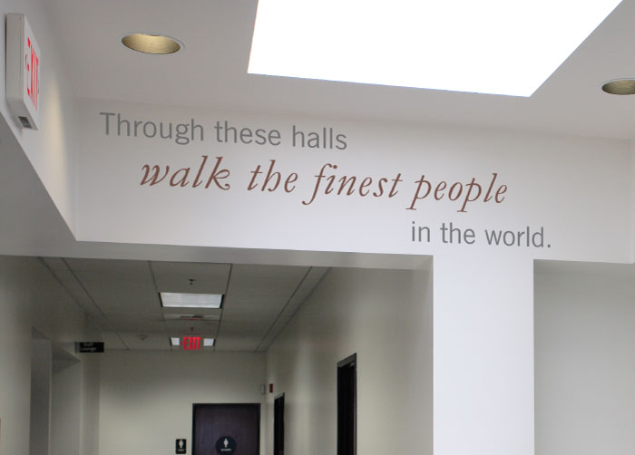 ‘Through these halls walk the finest people in the world’ wall words are a wonderful way to show your gratitude to those who work and do business with you. These words will look amazing in the entry and hallways in your institution. Our wall quotes are suitable for the corporate world: we have colors that will tie in with the company colors. They are also great accents and will not be loud! At WiseDecor we have wall lettering that will look amazing in your office. They are affordable and will fit in to your budget. We also have a customer awards program: you get to earn points with every purchase: a practical way to make sure you get more from your budget! Ordering is easy on our user friendly web site: use the previewer to make sure that you have selected the right size, color and style for your company walls. Are you looking for a fun yet subtle way to thank all that walk into your company? Try wall quotes from WiseDecor. They are unique, easy to apply, durable and we deliver on time. In short, they do meet all corporate decor requirements! Do call or email: we would love to hear from you. We have an excellent team of designers waiting to help you brighten your office hallways! |