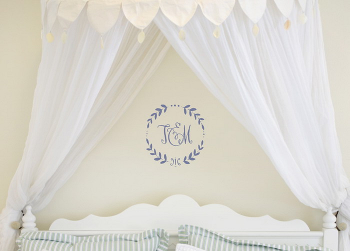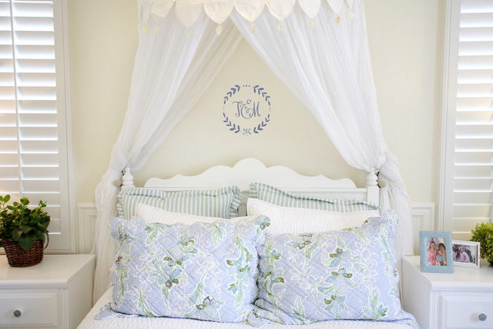 This is a lovely bedroom! The light white colors give this room an airy feel. The blue wreath wall words and the striped pillows are the perfect accents. They look great under the white canopy! Wall letters are a unique way of bringing some color into a monochromatic themed room.