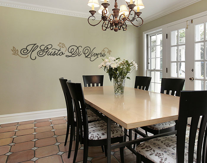 Life is a precious gift to us. It is something for us to enjoy. So C’mon, feel it, taste it. Savor the experience of being alive, being able to breathe, being able to enjoy the nature and the company of people we know, these and a lot more are priceless gifts of life. Life may have its moment of blindness, bitterness but overall, it is still sweet and magical for certain. So no matter what life throws at you, you are the chef of your life, the only person to decide what will be the flavor of your life. Accentuate your wall with this eye-catching popular Italian wall lettering, “Il Gusto di Vivere” which means “The enjoyment and flavor of life”. This wall decal is available in three exciting styles. Surely, this will invite joyful vibes into your home. It is a nice conversation piece perfect for your kitchen and dining areas. You and your friends will never run out of things to talk about life. Take a while to check our other wall decals on life, and be inspired by them. You can also find more of this kind in our dining wall décor, Italian quotes, life quotes. And if you enjoy the experience in our site and our wall decal products, refer your friends to us and we’ll give you rewards. Life is good. Enjoy every moment of your life and it will reward you a thousand fold! |