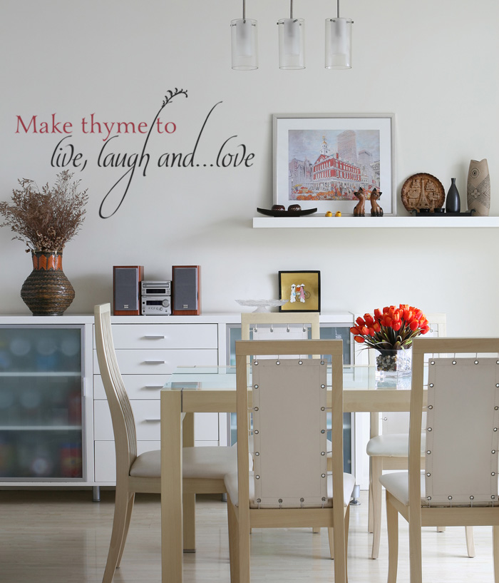 Since ancient times Thyme was used extensively as incense in temples and baths. The aroma can be relaxing and has anti-fungal, antiseptic and antioxidant properties. Just like our lives we should create things that can enhance on you live, laugh and love and there’s no other perfect place to experience these but in your own home. This wonderful wall quote can fit almost any room in your home, you can pick the dining area or any special and dear to you and your family.