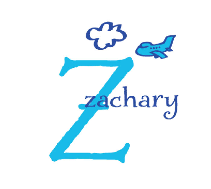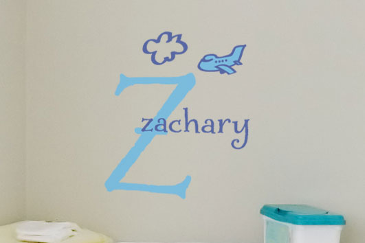 This photo shows the name Zachary. The playful blue lettering and the cartoonish airplane and cloud drawings is just the right wall decal design a boy would love. For a child to recognize his or her name easily, it requires to have a strong visual discrimination and word awareness. In this decal design, the letter Z is enlarged to create that visual awareness and signifies ownership. The surrounding elements are amusing but not distracting and the color blue just has the right contrast with the pure white background making it easily recognizable.