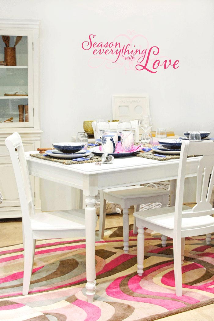 Let’s admit it, we all love good food. And what makes a food good? Of course, all its spices and seasonings take care of its delightful taste. But it all starts with her, the radiant happy cook. She sprinkles it with joy and spreads some cups of laughter. She also peppers it with excitement and adds a pint of pleasure. She also never forgets to blend gracefulness and to splash it with beauty as if everything you will see is a visual treat. She invigorates respect and harmony in everything around her. And most importantly, she seasons and shares it with love. And this Thanksgiving season, as we fill our tummies with sumptuous food; let’s also fill our hearts with love from our family and friends. One sure way to create more love affairs in our home in a fun, cost – effective way is through decorative wall lettering. “Season everything with love” is a wall lettering in two colors designed with touches of hearts, tiara and twigs. This easy to apply wall decal will surely bring more love into your homes. Can’t get enough? Browse our other love quotes, romantic and family quotes to choose from. |