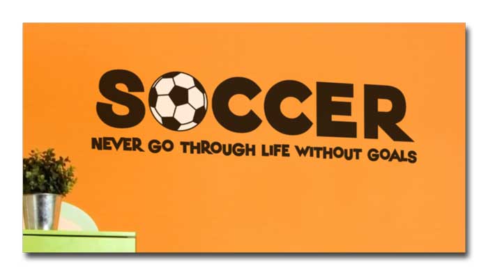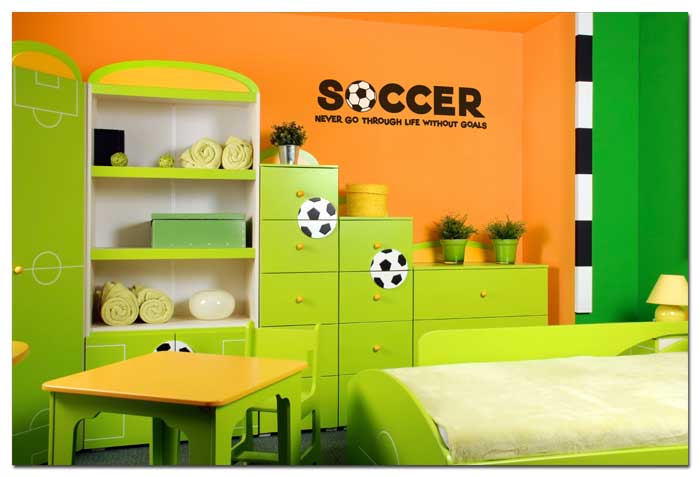 Are you planning to decorate your boy’s room but don’t know where or how to start? Why not create a conceptualized space for him? Start with this kid-friendly wall design in a soccer theme. There are two readily available wall decals for this soccer theme design. You can choose “Soccer: Play with all your heart” or “Soccer: Breathe soccer, eat soccer, live soccer.”
