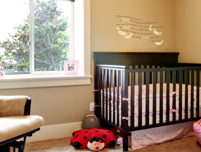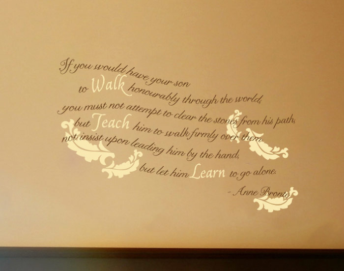 At WiseDecor, we have wall words that not only make your home look good, but they also help you let go! Here is a fine example: ‘If you would have your son walk honorably through the world, you must not attempt to clear the stones from his path, but teach him to walk firmly over them- not insist upon leading him by the hand but let him learn to go alone. – Anne Bronte’. As can be seen in this photo they are suitable for a boy’s bedroom. They also look great! Apply them above the bed on a contrasting underlying wall. Having them between sconces will create an amazing focal point!