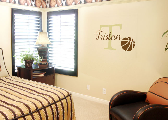 Basketball fans can decorate their wall space with decor that is sporty and cool with this custom monogram! At WiseDecor we love themed wall decals and ‘Basketball Name’ is just one example. We tried it out in this bedroom and were love the results! It all starts with identifying a suitable wall space. In this case, the wall next to the windows was ideal. We chose wall lettering styles and colors that are similar to those on a professional basketball player’s shirt. We made sure the colors fit in well with the underlying wall and the accents in the room: potted plants, duvet, framed photo and sporty chair in the room. The result is a personalized space that is relaxing and energetic at the same time!