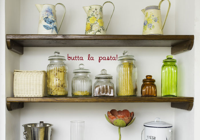 Open shelves is a creative solution to make your kitchen look more spacious and like what we have in this picture, using rich dark-toned wood on a crisp white wall puts together a stylish set of shelves. For an even more striking look, you can add personal collections like decorative metal watering cans, baskets, and other choice accessories — you already have at home. Using fluted glass containers with lids — or even repurposed glass jars! — is a wonderful way to display your pasta.