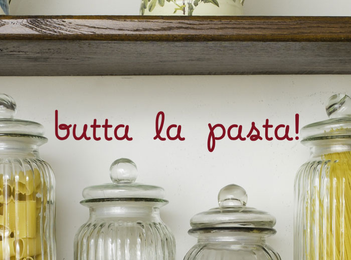 We take our hats off to the Italians for creating so many of these wonderful recipes and what better way to honor their food artistry than to ‘spice up’ our pasta shelves with the wall words ‘butta la pasta!’ This burgundy wall quote in noodle script lettering style will be a nice touch to every pasta-loving family’s kitchen.