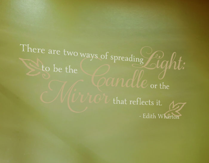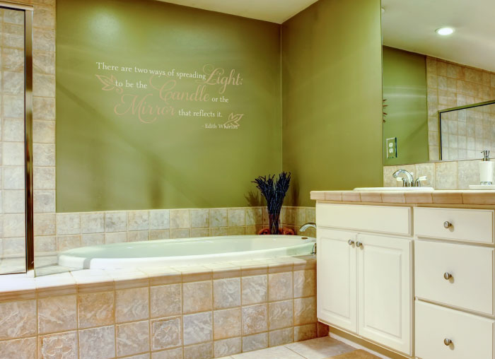 ‘There are two ways of spreading light: to be the candle or the mirror that reflects it. – Edith Wharton’ wall words are suitable for all the rooms in your home! We tried them out in this bathroom and they look great! The green underlying wall, recessed lights, tiles around the tub and the cabinets are excellent accents as are our wall quotes! The swirls and lettering art create a relaxing atmosphere. Bath time will be a delight!