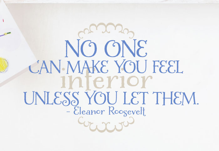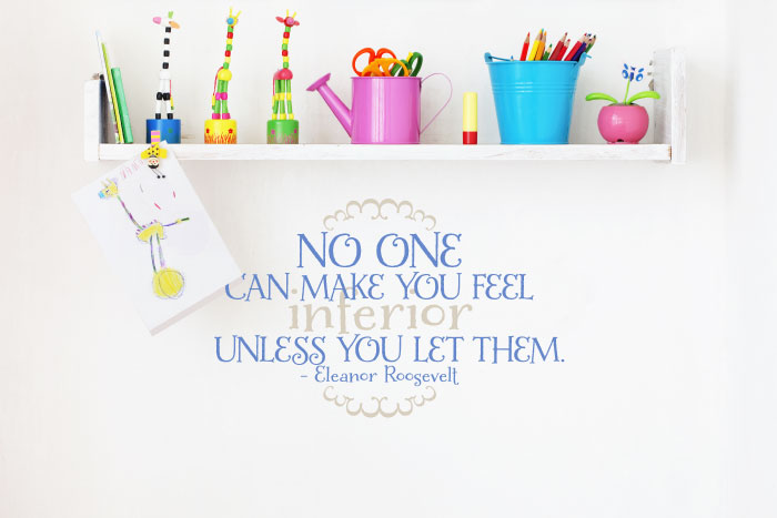 At WiseDecor, we have wall lettering that describes how to deal with self-worth matters. It is suitable for your kid’s room at home and in a number of wall spaces at school! ‘No one can make you feel inferior unless you let them. – Eleanor Roosevelt’ wall words look great in this classroom setting. The two colored wall letters are visible on this grey underlying wall. They tie in well with the classroom decor making this an eye-catching and thought provoking place to learn!