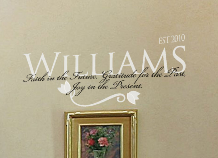 ‘Faith in the future Gratitude for the past Joy in the present’ wall words are available from WiseDecor. They look great in this family room. The family name is part of the wall lettering and it expresses what this family is doing about the past, present and future! They were applied between two windows that are framed by floor length curtains. The decor in this room was well thought out and the results are stunning. It is possible to have three different chairs in the room and still have a comfortable and balanced room! Our two colored wall letters are the perfect accent. They will point the family in the right direction!