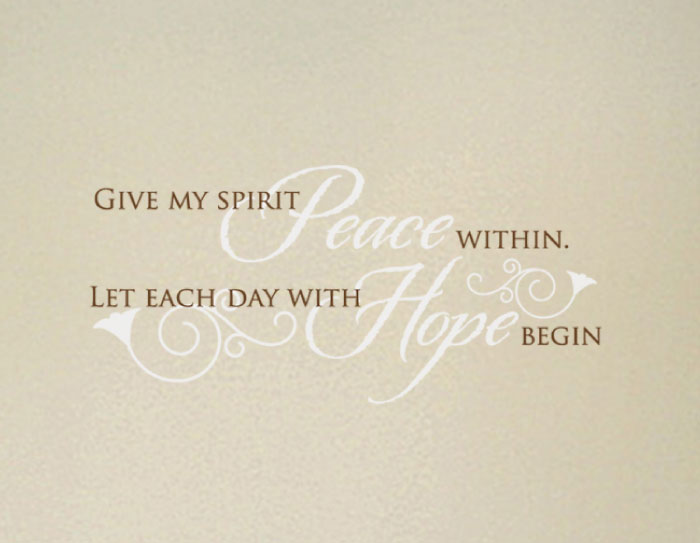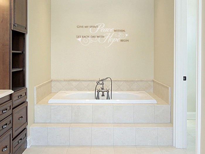 ‘Give my spirit peace within. Let each day with hope begin’ wall letters are just right for this elegant bathroom! They found a home on the wall space above the bathtub. The two colored wall words are the focal point and tie in with the decor in this room. The mirror, glass shower, recessed lights and bathroom cabinets are not only practical items but are also amazing accents! This is the perfect spot to catch up on ‘me’ time!