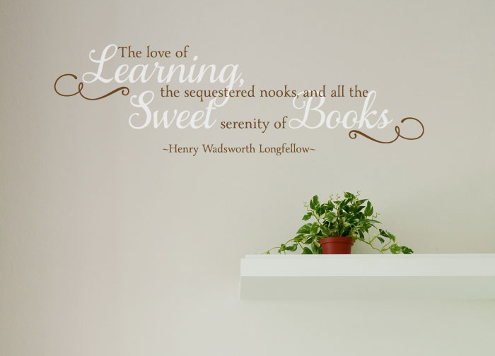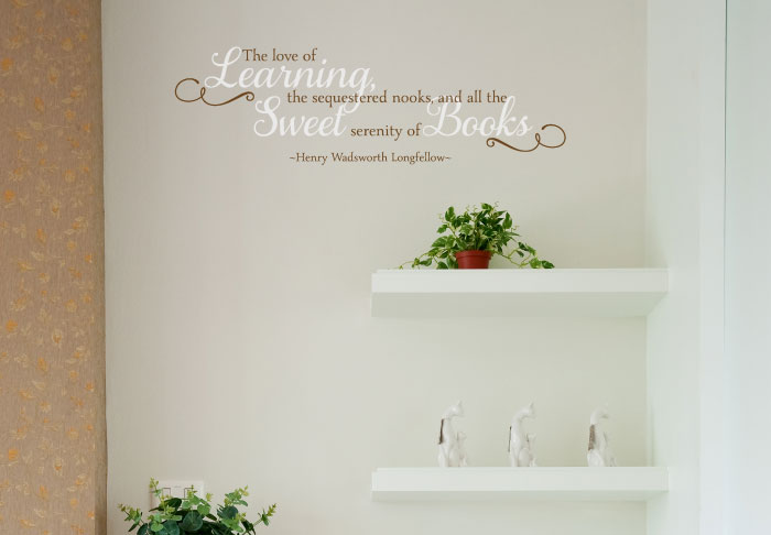 At DecorativeLettering, we have wall words that will help you cultivate a reading culture. ‘The love of learning, the sequestered nooks, and all the sweet serenity of books. Henry Wadsworth Longfellow’ wall decals are it! They not only look great on that wall space, but they create a desire for reading! They do tie in with the bright creeper on a red pot and the knick-knacks on the shelf. This is a serene atmosphere to get lost in a favorite book!