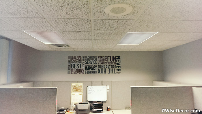 If you’re looking to decorate your office wall space, try WiseDecor products. Check out our ‘Office Rules’ wall letters in this photo. They look great in between the ceiling and the desk beneath. They not only help motivate but also bring in some style into this office space!