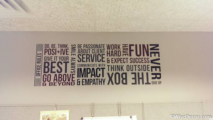 Grey is this office’s color theme with a splash of yellow on the ceiling and office calendar. Our black lettering is therefore easy to spot and read. To create visual effect we had the phrases in different sizes. The right and left borders were also laid out vertically. The effect is a creative office rules layout: everyone gets the message!