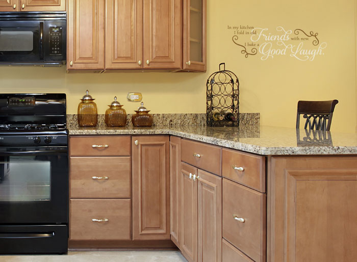 At DecorativeLettering, we have wall words that not only look good but also celebrate all things culinary! ‘In my kitchen, I fold in old friends with new. I bake a good laugh’ wall letters sum up the good times we share while cooking. They are at home on the yellow wall above the island and are the focal point in the room! They tie in with the marble countertops, fan, and the stainless steel appliances! The wall lettering will be a celebration of old and new friendships! Our products are affordable! We have a customer award program that enables you to enjoy higher purchasing power! With every purchase, you get to earn points. Redeem the points or gift them so do sign up! If you refer us to a friend, they will get 10% off on their first purchase. Now that is a deal! For well-lit kitchens such as this one, we recommend matte wall quotes. This enables you to see them without glare problems. They are also durable. This means that the high temperatures in the kitchen do not affect them: you will enjoy them for years to come! If you are looking for unique kitchen wall decor, try DecorativeLettering products. Do call or email. We would love to hear from you! Let us help you decorate with relationship building wall decals! |