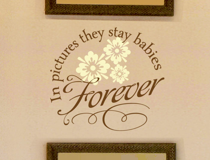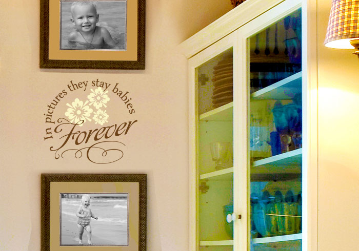 We have wall decals that are suitable for photo walls. ‘In pictures they stay babies forever’ wall words is one example of what we have in store. They look great in this family room! We applied them between two framed photos and they also tie in with the checked lampshade, eggshell wall and the glass wall unit. The wall lettering style creates a playful mood in this space. They certainly are the right wall decor pieces! Our wall letters are easy to apply. They have no clear film around them giving them a painted look but without the hard work that goes with painting! They are delivered pre assembled so that all you have to do is peel the sheet and paste the adhesive side to the wall. That’s how simple it is to transform your walls with our unique wall quotes! Our wall words are available in many colors, styles and sizes. Check us out on our user friendly website and place your order! Our wall decor is affordable, durable and stylish. It is also custom made making it easy to own a one of a- kind wall lettering! Give your family photo wall that something extra with unique wall quotes from WiseDecor. Get in touch! |