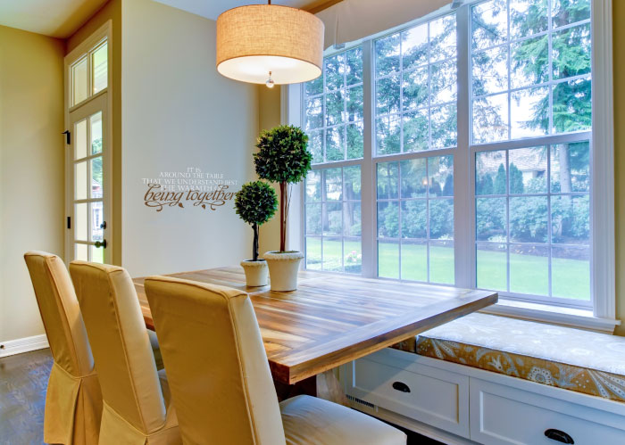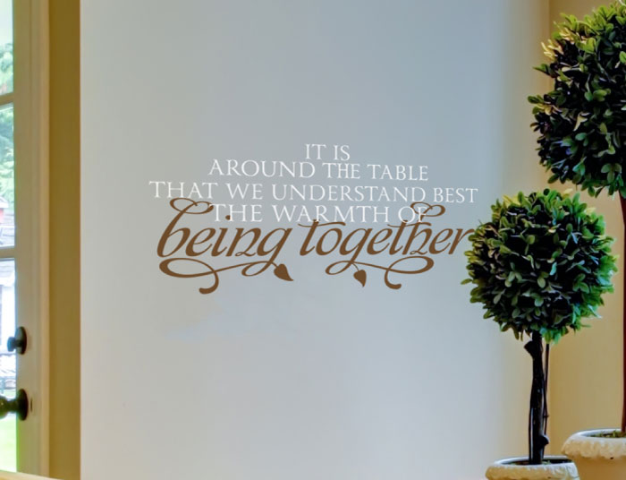‘It is around the table that we understand best the warmth of being together’ wall words are dining room friendly. They are also custom made to fit into your style! We chose them for this stunning space shown in the photo. The theme here is outdoors based. We chose colors for the lettering that tie in to this style. They also complement the furniture in the room: Parsons styled chairs, wooden dining table and the potted Bonsai plants. Your friends and family will enjoy the dining experience that is aptly described by the eye catching message on the wall!