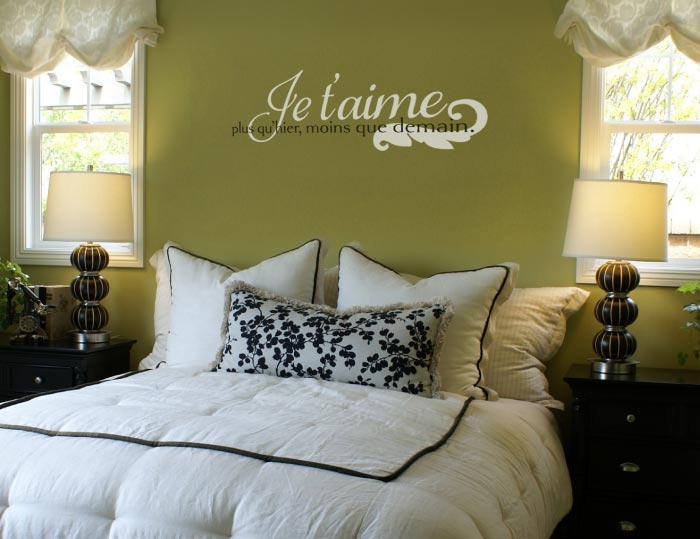 At DecorativeLettering, we have wall decals suitable for every wall space in your home. We have them available in English and foreign languages too! ‘Jet’aime plus qu’hier moins que demain (French to English translation I love you more than yesterday, less than tomorrow.) wall words are a perfect example of what we have in store. These are appropriate for your bedroom. As shown in the photo, they look amazing above the bed.