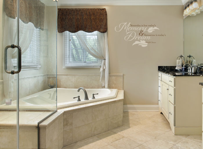 ‘Yesterday is but today’s memory and tomorrow is today’s dream. – Khalil Gibran’ wall words aptly describe time! They look great in this bathroom .The two colored wall lettering certainly gave this bathroom some oomph! The wall is no longer an empty space but a mini gallery! The key words in the wall letters are in large print and of a different writing style. This only makes them more appealing! The underlying wall is the perfect color to ensure that there is visibility! Wonderful memories of quality ‘me time’ are assured in this space!