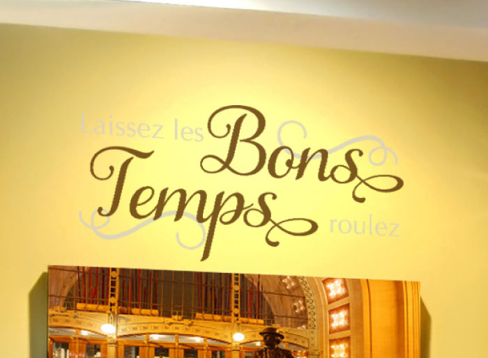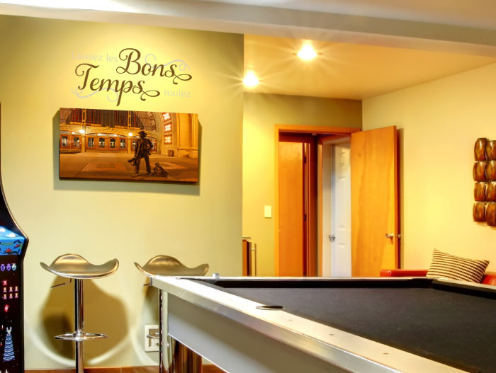 ‘Laissez les bons temps roulez’ meaning ‘Let the good times roll’ wall words are just right for this fun room! We applied this wall lettering above the framed artwork. Next to them was a colorful machine: that promises to keep everyone occupied for hours! Whether you are playing pool or just catching a favorite game on the television, our wall quotes will be a reminder of the awesome fun times you have with your friends and family in this room!
