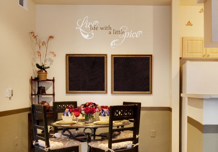 Decorating small spaces can be challenging. At WiseDecor, we have made it easy to decorate small wall spaces. We have wall words that will fit into any space and still look great! We put a circular table in this breakfast nook/ dining room. This would enable us host more people should the need arise. We chose wall letters that were the perfect complement to the underlying wall. Not only would they stand out but also they would be easy to read without glare issues! We made sure that they were also great accents and tied in to the chairs and the framed artwork. Friends and family will enjoy dining in a space where the host has learnt how to creatively “live life with a little spice”!