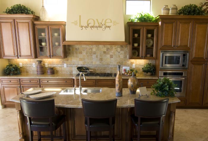 The ‘Love is all around you’ wall quotes on the kitchen hood sums up the atmosphere in this room. The embellishments create a whimsical feeling that is just right for this cooking space. Friends and family will enjoy their meals and chats around the kitchen island and appreciate the truth in the wall letters! At DecorativeLettering we have wall lettering suitable for your kitchen. They are durable and will last a long time. They are able to withstand extreme temperatures: they will continue to look great despite the warm temperatures that go with whipping a meal over the cooker for your family and friends. Are you looking for a unique way to decorate your kitchen? Are you looking for wall words that will encourage your loved ones to look for love in the right places? Try DecorativeLettering products. Have a look at our kitchen category: we have wall decals that touch on love! Place your order on our easy to use web site: it will be delivered on time. You’ll also get practice lettering that will help you get familiar with the application process. Do call or email: we would love to make your kitchen decor dreams come true. We have an excellent team of designers waiting to work and deliver wall letters that you and your family will enjoy for years to come. |
