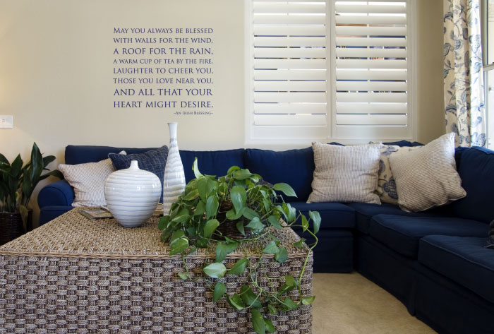 At DecorativeLettering, we have unique wall lettering! ‘May you always be blessed with walls for the wind, a roof for the rain, a warm cup of tea by the fire laughter to cheer you, those you love near you, and all that your heart might desire. ˜House Rules version 1’ is an example of what we have. The message on it shows that you want the very best for your family and friends. We applied it in this family room: it looks great! The wall quotes found a home on a white underlying wall. The sectional couch below calls attention to them: they are the focal point! They also tie in with the potted plants, cushions and the knickknacks on the coffee table. This is a comfortable space. Your guests will love the encouraging and stylish wall decor in your home!