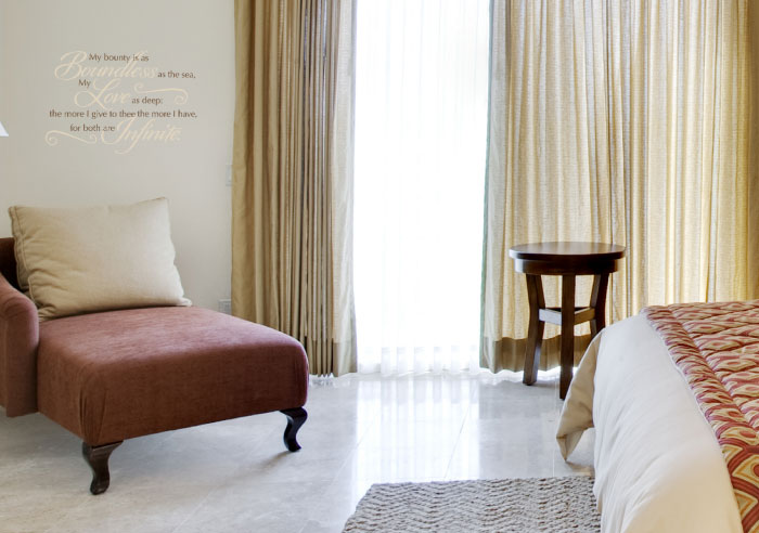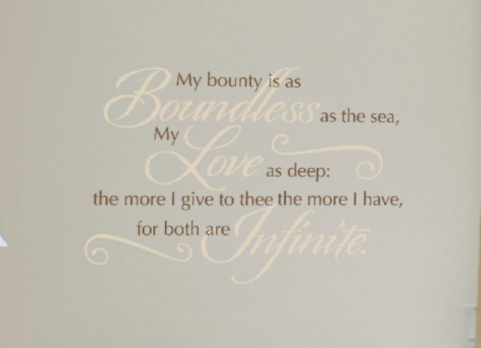 At DecorativeLettering, we have what you are looking for! We have wall words suitable for every wall space in your home. ‘My bounty is as boundless as the sea My love as deep: the more I give to thee, The more I have, for both are infinite’ wall letters are an example of what we have. They look great in this bedroom! We applied them above the lounge chair. They tie well to the floor length curtains next to them and the bedside lamps, pillows, bed skirts and mat! Waking up to these wall quotes will be a reminder of the commitment you have to your spouse. How precious!