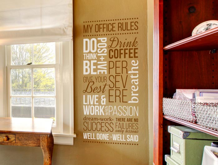 Pay us a visit on our website. It is user friendly and filled with uplifting words. Owning these wall letters is easy! Place your order online and our talented designers will work on it. You will end up with wall decor for your home office that will spur you on for years to come. Do you live overseas? You too can enjoy our wall quotes. Get in touch. Let us help you turn your home office into a great working space!