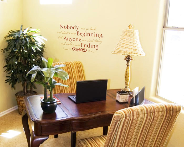 This wall lettering can transform lifeless and bare walls. Since you can customize your own design for any wall quote in mind, long wall sayings such as this gives you a great opportunity to explore combinations of different text styles. You can place the wall decal almost anywhere at home or office. You can place this wall saying on your bedroom walls to remind you every night before you sleep or give interest and warmth to a cold and dull bathroom area. Aside from private areas in a home, you can place it at work areas to motivate you in your job. You can also brighten up the living room or family room where friends and family gather and where you can get everyone to be optimistic. Have the wall decal applied above a fireplace mantel, above or beside cabinet displays, among plaques or awards, around above walls or above windows and doors? There are so many design possibilities. As seen in the image, the wall lettering fits the room design very well. This office design with has a feel of the 1950’s design in combination with organic elements. The wall decal’s design fits this classical look perfectly with its formal yet warm use of red and brown hues. The use of red color for the text allows it to sync with the existing maple and red colors of the furniture. The strong red strips on the furniture go along well with the wall quote design giving it a unified look. |
