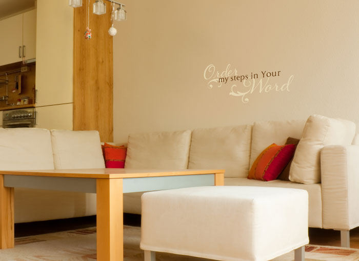 At DecorativeLettering, we have scripture wall decor that inspires, directs and looks great! ‘Order My Steps In Your Word’ vinyl wall words are just right for this open plan room. They not only help in creating two spaces in one room but their colors tie everything together. There is no color clashes, just perfect harmony! They look amazing above the couch. The wall lettering style gives this space a stylish and upbeat look. Your family will enjoy spending time here. It is a space that has a life changing and inspiring message!