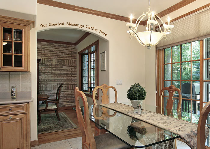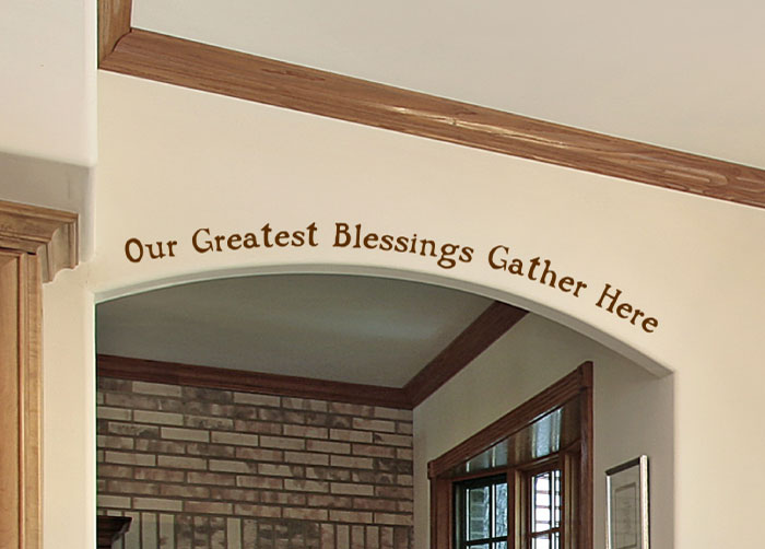 “Our greatest blessings gather here” wall words found a home on the wall space above the arc connecting two living spaces. This dining room just got endorsed as a special family space! The lettering style is bold and visible to everyone. Applied at eye level, it holds its own against the striking chandelier above the glass dining table. Their earthy colors are ideal for this space and tie in with the outdoors theme in the room. Your family is precious and this is a great way to acknowledge their presence!