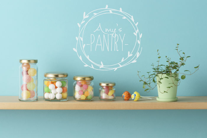 One stylish idea we can share is to decorate your pantry with a name sign like this ‘Amy’s Pantry’ wall decal. For this very special wall word décor, you customize it by putting your name and choosing from the words pantry, kitchen, cucina, cuisine, cocina or bistro. See how attractive it looks in our live design previewer in the color and size you want. Choose from our selection of rich colors that also includes satin and glossy hues.