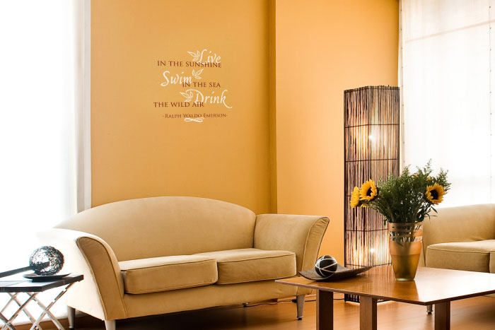 ‘Live in the Sunshine Swim in the sea Drink the wild air. – Ralph Waldo Emerson’ wall words meet this need. We tried them out in the living room that blends comfort and the outdoors look in a remarkable way! Natural light streams in from the windows and draws the eyes towards the wall letters. The wall letters look great on the wall space above the couch and contrast well with the orange underlying wall! They do hold their own against the rustic coffee table and sunflowers. Friends and family will certainly enjoy this space with its unique, decorative message on the wall! At DecorativeLettering, we have wall quotes that are suitable for all wall spaces in your home and business as well! Our wall decals are available in a variety of colors, style, and size. You will find something that will fit into your wall space and match your decor! Our designers are good at what they do. You will end up with quality wall lettering you will enjoy for years to come! Our wall words are durable and affordable. Resin made, they are resistant to extreme temperatures and will look great every season. Friends and family will enjoy spending time in this space with inspiring wall words. Get in touch! |