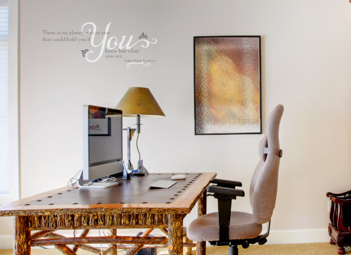 At DecorativeLettering, we have made it possible for you to enjoy sayings from famous people on a daily basis. Wall words are it and they give your walls a new lease of life! The home office in the photo is a great example. We applied the wall quotes on a gray underlying wall that was initially blank. It is now the focal point in this room! The two colored wall letters tie in well with the rest of the decor in the room. The colors complement and brighten the room. The wall lettering style is bold and firm and catches the user’s attention. Working here will be an exciting experience: daring to do the impossible will be challenging but fun!
