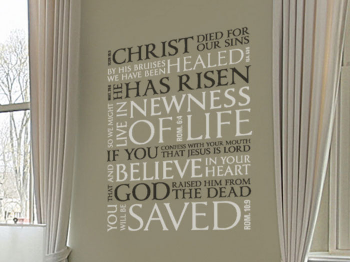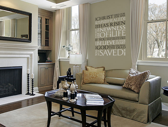 We applied wall letters on the wall space between the windows and it instantly became the focal point! They look great above the couch. The lettering style is bold and in two different colors. They tie in with the coffee table, lampshade and the framed mirror above the fireplace. Matte coating on the wall words makes them visible and glare-free despite being near a light source. This is a superb space for relaxing and meditating on God’s wonderful plan of salvation!