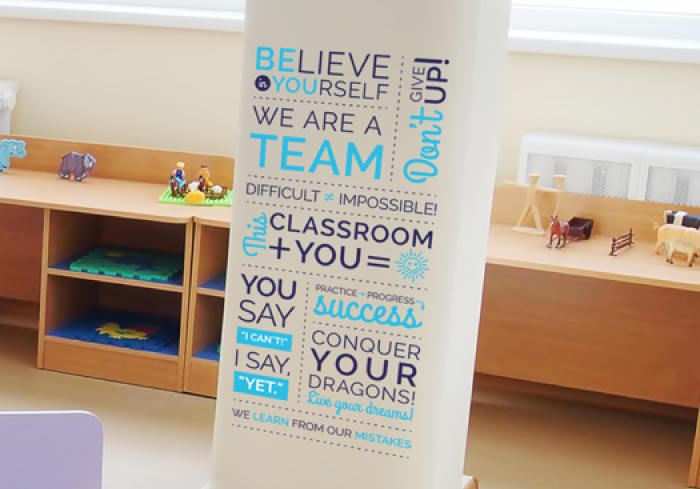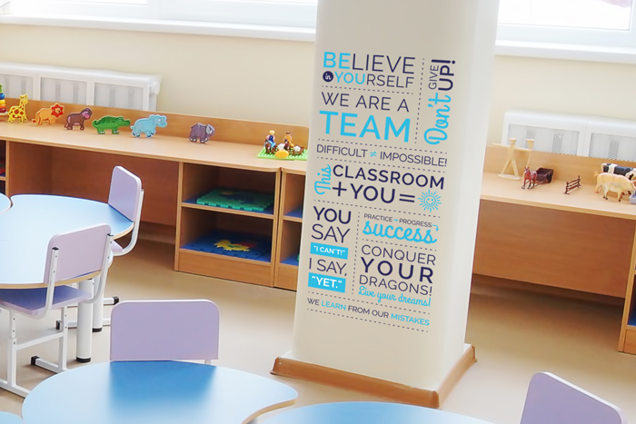 “Upon being presented with these uplifting quotes, I knew I wanted to make a design to help them to stand out. I kept the text simple but used pops of color and a fun script font to make the wall decal engaging. This will help to grab the children’s attention and draw them in to reading these encouraging messages. My hope is that this design inspires children and helps them to have confidence in themselves and their abilities.”