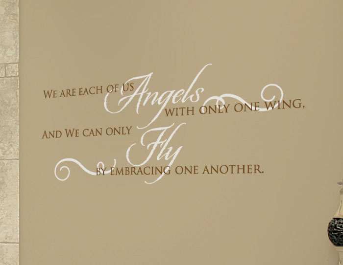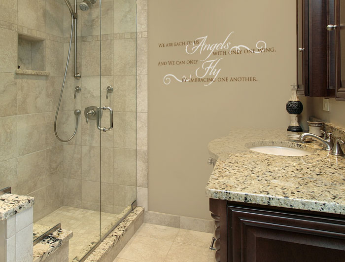 ‘We are each of us angels with only one wing and we can only fly by embracing one another’ wall words sum up this God given desire! They are suitable for any wall space in your home. We tried them out in this bathroom. They look amazing! They certainly turned a blank wall into a work of art! They tie in with the marble countertop tiled floor and the stainless steel taps. What a great spot to apply them and remind friends that they should not take each other for granted!