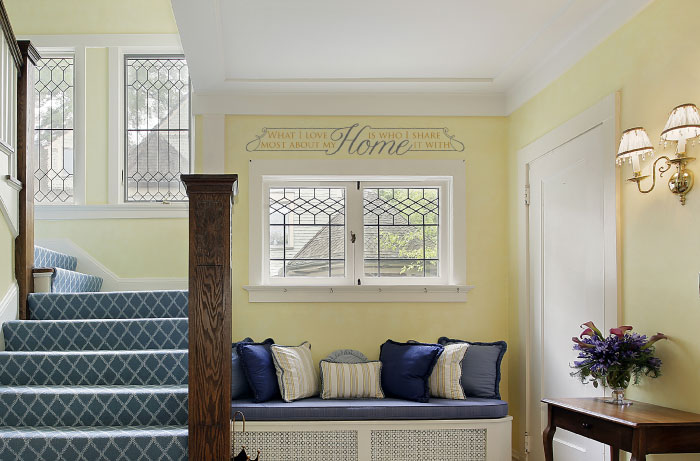 In this photo, we applied wall lettering from DecorativeLettering in the foyer. The baby yellow underlying wall was the perfect backdrop for it. They go very well with the timber floors, cushions, white molding on the window and the blue-white carpet along the stairs. The fresh flowers brighten the room and match with the wall words. This foyer will put all at ease because the wall quotes encourage that frame of mind.
