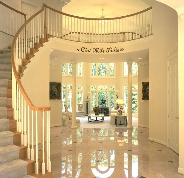 Art: Fancy Ends Pair A & B (3 inches)You can’t help but feel welcome when you enter this home. And if you’re Irish, you know that you’re being greeted with a hundred thousand welcomes – that’s what Cead Mile Failte means. Our homeowners felt that this well-known Irish saying was an appropriate greeting for their guests and so far, they have been right.Getting this Irish saying to look as perfect as it does wasn’t all that difficult, either. That’s because rather than messing around with a stencil, or a painter, or trying to mount multiple wooden letters, the homeowners opted to give our wall letterforms a try. As difficult as this perfectly-spaced project appears, this phrase and embellishments were in place and ready to be admired in less than 15 minutes! The homeowners did not have to hire professional installers or purchase any special installation tools. (They did however need a very tall ladder, which they had!)Their Irish saying arrived on a roll that consisted of 3 different layers. They unrolled the phrase and taped it into place. When they were satisfied with the positioning, they flipped up one of the layers and pulled away the protective backing paper and allowed the phrase to fall back into place. They then took the tool that we provide with every order and began rubbing out each of the letters. When they finished rubbing, they carefully removed the excess material and the project was complete.Needless to say, these happy homeowners have become repeat customers, applying decorative wall sayings throughout their home!