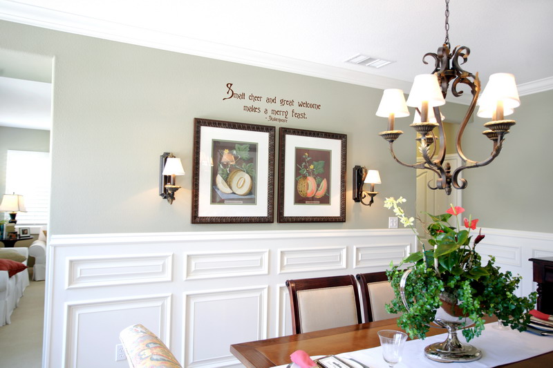 The decorative lettering in this dining room uses the Goodfellow lettering style, in a Chocolate Brown color and 3 inches high, with the first letter – S – done in a drop capital style in 4 inches to add style to the lettering. The medieval style font is set against a pale color wash on the dining room wall, and the old world decorative lettering style complements the elegant look of the room. The decorative lettering looks like it was hand stenciled, and nobody will ever know you bought it online and placed it on your wall within just ten minutes.