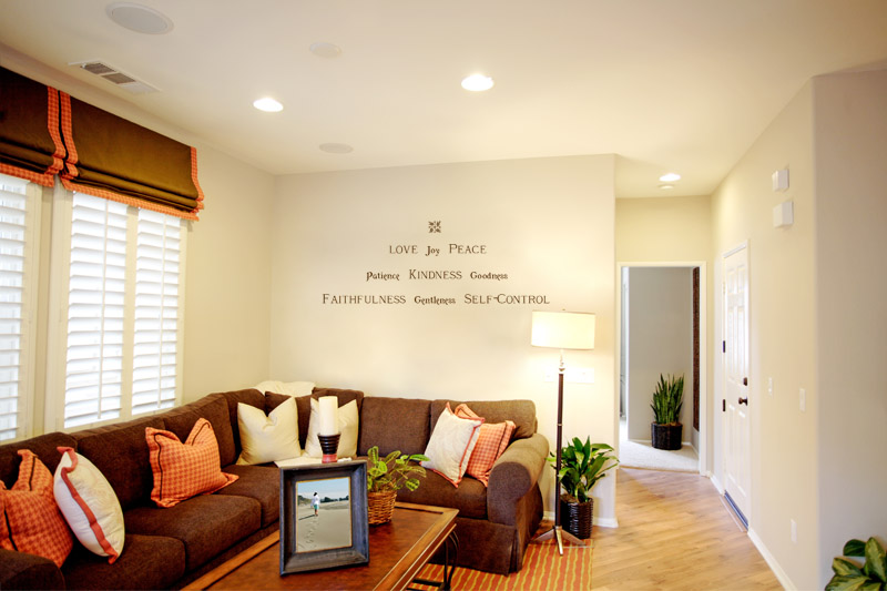 If you have a quote or verse you particularly like but find that it’s too long to place on your wall as decorative lettering, you can choose a part of the quote and jazz it up by using different font styles. This quote was taken from the Bible verse Galatians 5:22-23. The original verse is extra long, so we took the main thought/words and used a combination of the Chambord (French category) and Flaubert (French category) lettering styles to highlight the individual words. We chose the Chocolate Brown color, 3 inches, to match the quote to the sitting room’s color scheme. As a final finishing touch, we added the Rose Crest – Lettering Art – 2-7 at the top of the 3-line quote. The play of fonts creates a visually pleasing display that makes brings out the special meaning of the verse.