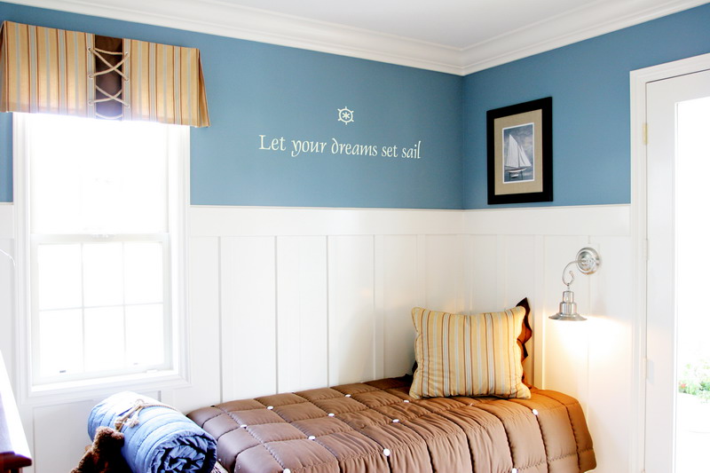 This teenaged boy’s bedroom is quite small, and the room was built and painted in such a way that there is only less than one third of the room’s height left for a possible accent. The lower two thirds of the walls feature wooden panel boards, painted white, and a narrow white painted strip above it, running across the entire room. The upper third of the wall is finished with satin paint in grayish blue. A framed print of a sailboat hangs on the wall above the bed, near the door.