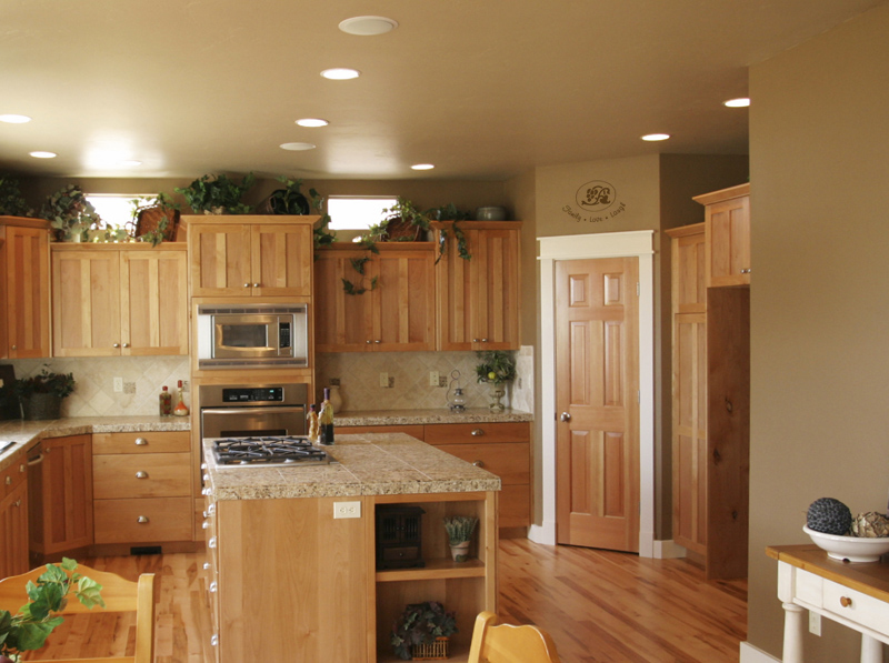 For this decorative lettering we chose the Darling Monograms – 5, and inside the border we put the Lettering Art 9-2, a lovely grape design that we thought would go well with the grape vine theme. Underneath it, we placed the quote “Family, Love, Laugh” which we did in the Freehand (General category) Lettering Style in Chocolate Brown, 1 inch high. Because the monogram was not very wide we kept the quote short. The Chocolate Brown color was chosen for an understated effect, and its placement – above the door in the same line of vision as the grape leaves above the cabinets – perfectly shows the continuation of the theme. It is subtle, it fits in, and it looks ever so elegant!